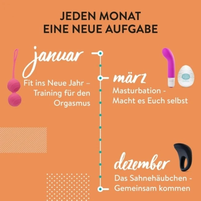 Jeder Monat steht unter einem anderen Motto! Entdeckt so gemeinsam prickelnde Momente beim Oralsex, erotischen Massagen oder ersten Bondage-Erfahrungen. Öffnet einfach jeweils zu Beginn eines Monats das passende Türchen. Natürlich müsst Ihr nicht erst auf den Januar warten, sondern könnt auch mitten im Jahr einsteigen – die Themen und Produkte bauen nicht aufeinander auf.
