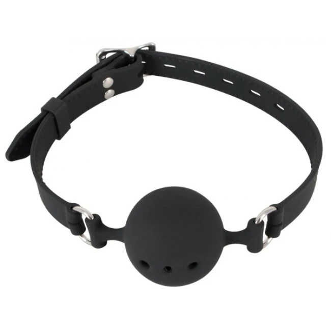 Schwarzer Knebel mit Luftlöchern fürs lange Durchhalten und verstellbarem Riemen. Knebel-Ø 4,5 cm. Material: Silikon.