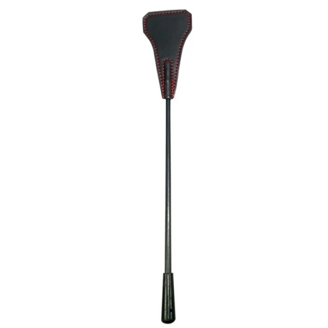 Kleine schwarze Gerte mit Schlagpaddel (Optik kann variieren). Eine Seite in Lederoptik, die andere mit Kunstfell. Nähte in Rot.