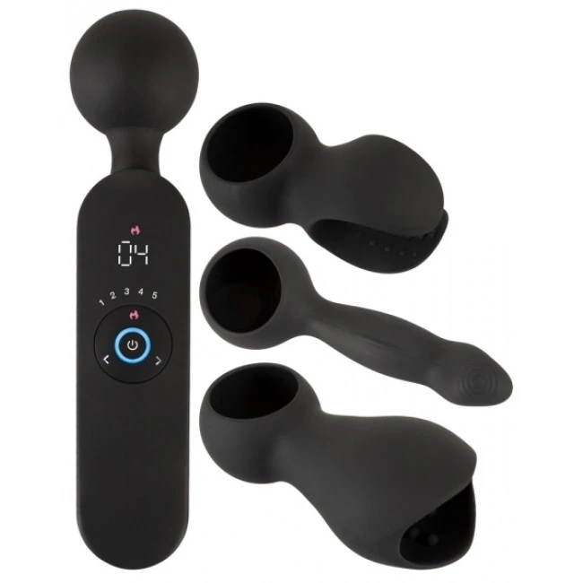 Wiederaufladbarer Massagestab wand vibrator with 3 Attachments von Coup!es Choice mit flexiblem, stark vibrierendem Massagekopf. Das ergonomische Design mit langem Griff erreicht spielend leicht alle Körperpartien und äußeren Lustpunkte, um diese vibrierend und massierend zu verwöhnen. Für intime Massagen liegen 3 verschiedene Aufsätze bei: ein offener und ein geschlossener Noppen-Masturbator, sowie ein reizstrukturierter Dildo. Die seidig soften Aufsätze sind leicht aufgesteckt und schnell austauschbar.
