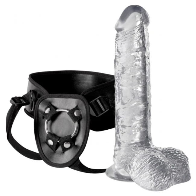 Strap-on with Harness von Crytstal Clear bestehend aus transparentem Penisdildo mit Hoden und Saugfuß, der an dem beiliegenden verstellbaren schwarzen Gurt (60-157 cm Umfang) an seinem Ring einfach und schnell befestigt werden kann.