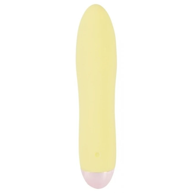 Gelber Minivibrator in schlankem Design. Mit 7 verschiedenen Vibrationsmodi und wiederaufladbar mit beiliegendem USB-Ladekabel. Einfache Handhabung und elegantes Design. Wasserdicht.
