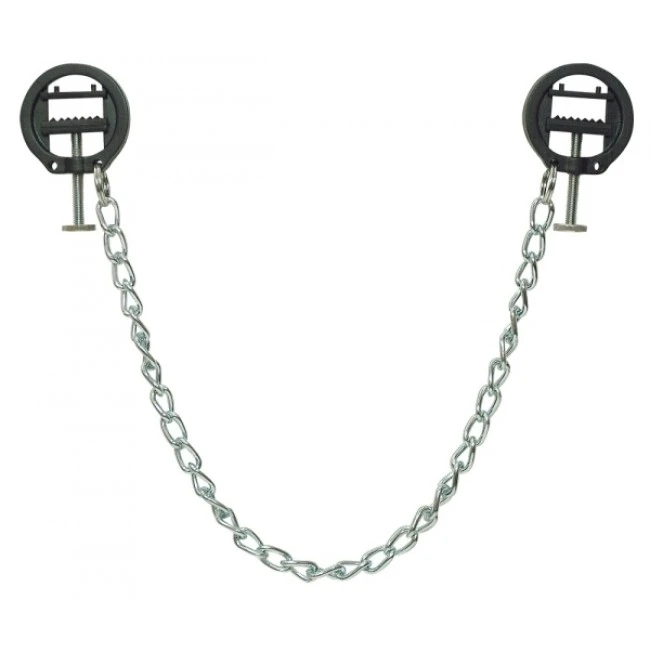 2 schwarze, runde Nippel-Schraubzwingen, verbunden mit federleichter Metallkette. Druckstärke der Zwingen individuell justierbar.