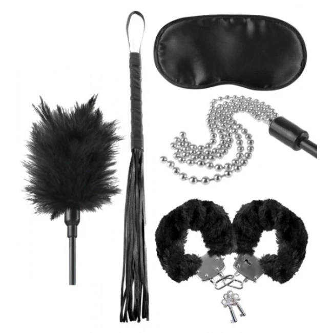 Mit diesem 5-teiligen Set kommen Einsteiger in softe BDSM-Sessions voll auf ihre Kosten. Das Set beinhaltet einen Federstab, eine kleine Striemenpeitsche, eine Satin-Augenmaske, Handschellen mit Plüschüberzug und eine kleine Perlenkettenpeitsche.