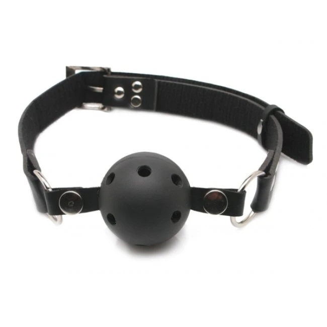 Für Spiele der Lust und Unterwerfung ist dieser Knebel genau das richtige Utensil. Der bissfeste Knebelball verfügt über Atemlöcher und sorgt für schweigende Lustmomente mit ausreichender Luftzufuhr. Der Kopfriemen aus Lederimitat ist für jede Kopfgröße mit dem Schnallenverschluss verstellbar.