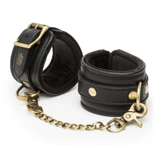 Stabile, hochwertige Handfessel Bound to You Wrist Cuffs von Fifty Shades of Grey mit abnehmbarer Karabiner-Verbindungskette. Handgefertigt aus stilvollem Lederimitat mit edlen antikgoldfarbenen Metallelementen. Die mit seidig weichem Velours gepolsterten Manschetten sind jeweils mit Schnallenverschluss im Umfang passend verstellbar.