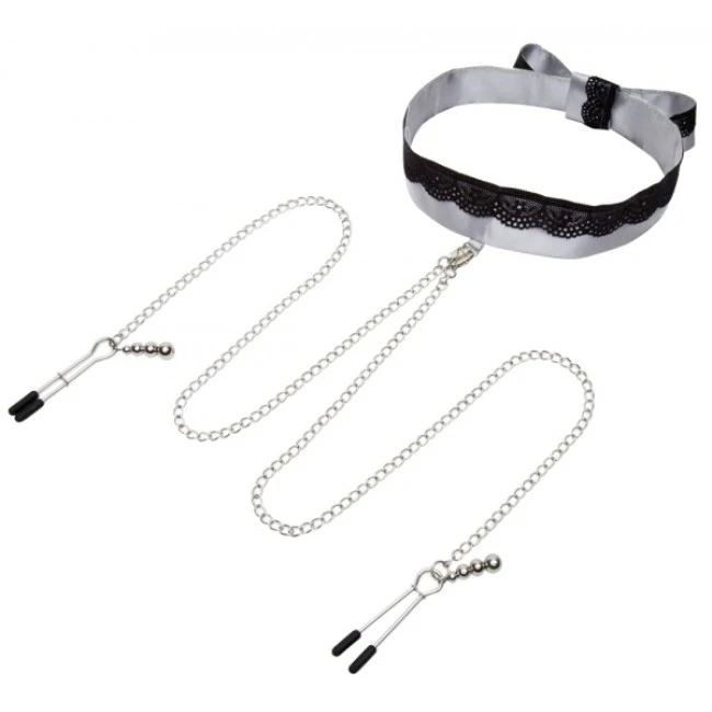 Elegantes Halsband Sweet Play Nice Satin Collar & Nipple Clamps von Fifty Shades of Grey mit Nippelklemmen an Ketten. Das silberfarbene Satin-Halsband mit zarter schwarzer Wimpernspitzen-Verzierung ist 1,10 m lang und individuell passend bindbar. Die Ketten mit den Nippelklemmen sind mit kleinen Karabinern vom kleinen Ring am Halsband abnehmbar. Die Klemmen sind in ihrer Druckstärke mit Schieberingen justierbar.
