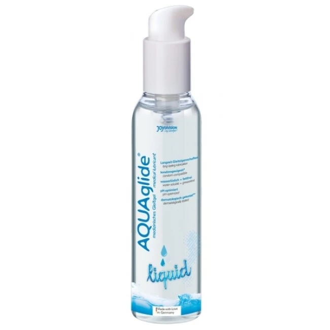 AQUAglide liquid ist das einzige flüssige Gleitmittel auf Wasserbasis. Fließende Konsistenz für noch mehr Spaß zu zweit für ein besonders intensives Lustempfinden – überraschend anders für ein einzigartig natürliches Gefühl. Einfache und praktische Anwendung. Dermatologisch getestet. Latexkondom-kompatibel und pH-optimiert. Kristallklar. Vegan wie alle AQUAglide Produkte. Made in Germany.