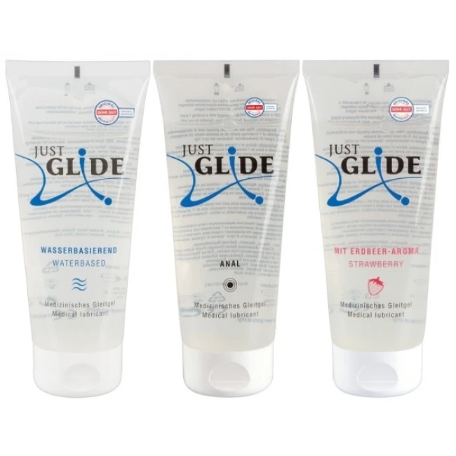 3 Just-Glide-Gele auf einmal im Vorteilspack. Just Glide auf Wasserbasis ist zu 100% vegan und eignet sich auch für die Anwendung auf sensibler Haut. Öl- und fettfrei. Abwaschbar. Latexkondomsicher.