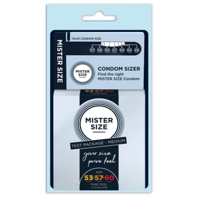 Mister Size ist die Kondommarke nach Maß für ein sicheres und komfortables Gefühl. Dieses Test Package Medium enthält 3 Kondome mit einer Breite von 53 mm ? 57 mm ? 60 mm passend für einen Penisumfang von 10,5 cm ? 14,5 cm. Da ist bestimmt die richtige Kondomgröße dabei!