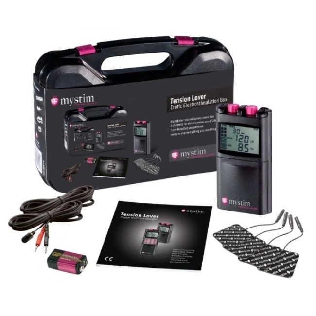 Digitales Reizstromgerät für E-Stimulation. 2 getrennt regulierbare Kanäle, 7 Programme zur Befriedigung individueller Bedürfnisse. Mit Zeitschaltuhr: 10, 20, 30, 40, 50 und 60 Minuten. Intensität, Impulsbreite und Impulsfrequenz können weitestgehend selbst bestimmt werden. Mit Tastensperre und extra großem Display. Lieferumfang: 1 digitales Mystim Elektrostimulationsgerät, 1 stabiler Hartschalenkunststoffkoffer, 4 selbstklebende Elektroden, 2 Elektrodenkabel für selbstklebende Elektroden, 1 Batterie, 9V, 1 Gebrauchsanweisung in deutscher, englischer, französischer, niederländischer und spanischer Sprache.