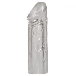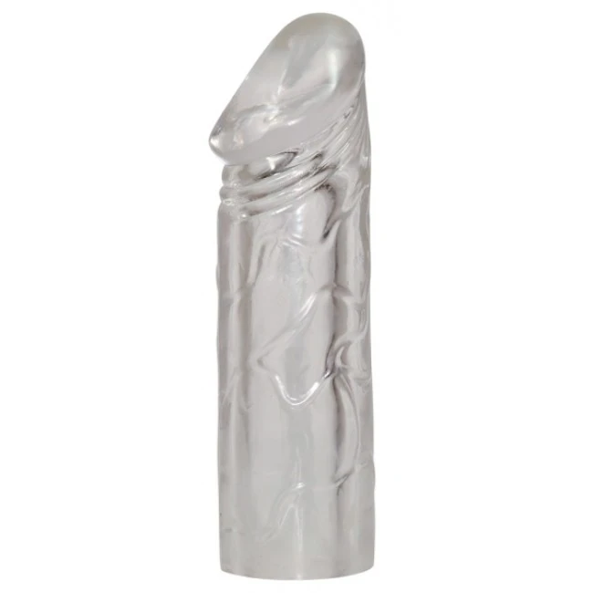 Transparente, prall geäderte und stramm sitzende Penishülle für einen dickeren und 5 cm längeren Penis. Gesamtlänge ca. 19 cm. Material: TPE.