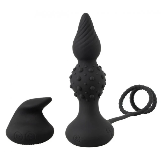 Der RC Butt Plug with Cock & Ball Rings von Rebel ist ein kombinierter Penis-/Hodenring mit fest arretiertem Vibro-Analplug mit Standfuß, der über die raffinierte Fernbedienung bequem steuerbar ist ? mit einer Reichweite von bis zu 10 Metern auch vom/von der Partner:in.