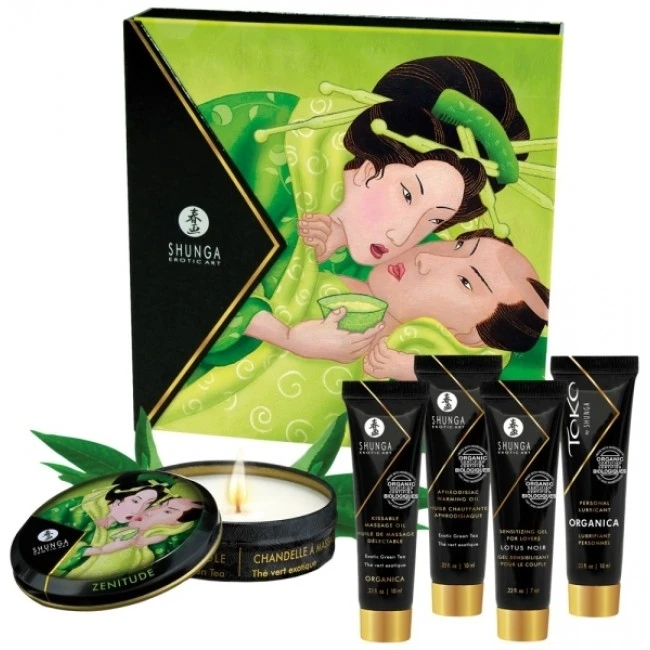 Das Geisha’s Secret Kit Organica enthält 5 Miniaturen der luxuriösen Produkte von Shunga für sinnliche Partnermassagen und leidenschaftliche Liebesspiele. Jedes Massageprodukt mit betörend exotischem Grüntee-Aroma, das sämtliche Sinne weckt und Lust aufs Berühren und Vernaschen macht. Dazu ein exzellentes Toko-Gel und ein raffiniertes Stimulationsgel für aufregende Empfindungen. Beides enthält rein pflanzliches Glyzerin für mehr Feuchtigkeit und Geschmeidigkeit.