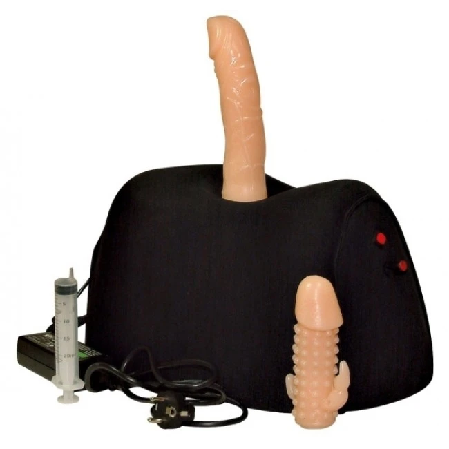 Schwarze Sexmaschine mit zwei befüllbaren Dildos. Die Stoßfunktion und Ejakulation kann per Knopfdruck ausgelöst werden. Von 50 bis 350 Stöße pro Minute. Netzgebunden. Der Stoffbezug ist abwischbar.