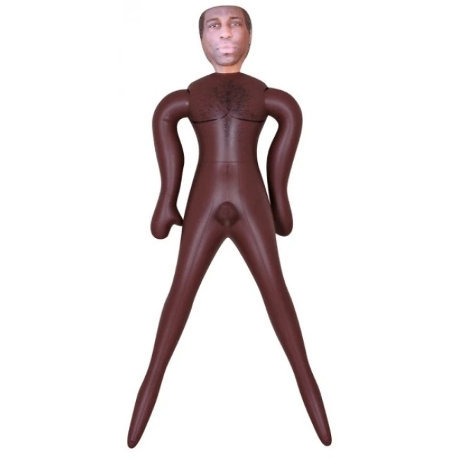 Männliche Liebespuppe mit festem Penis, enger Anusöffnung, aufgedrucktem Gesicht, dunklen Haaren und aufgedruckter Brustbehaarung. Aufgeblasen ca. 160 cm groß. Material: PVC.