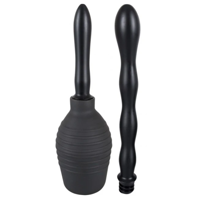 Schwarze Intimdusche (13 cm hoch, Fassungsvermögen 300 ml) mit zwei austauschbaren Schraub-Aufsätzen mit Spritzdüsen. Einfach zu reinigen. Langer, gewellter Aufsatz: Gesamtlänge ca. 23 cm, Ø 1,7-3 cm. Kurzer, glatter Aufsatz: ca. 11,5 cm lang Ø 1,9-2,3 cm). Material: PVC.