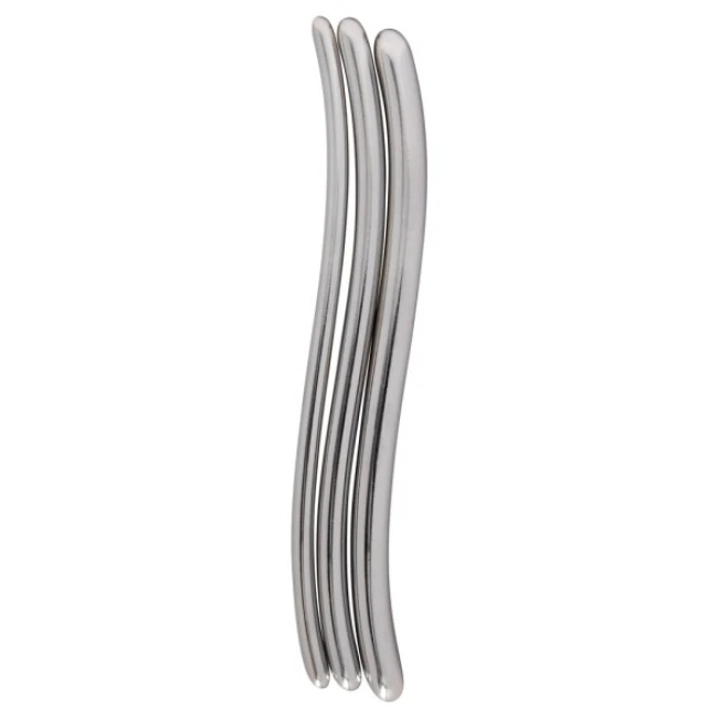 Dilator-Trio in unterschiedlichen Größen: 3 leicht geschwungene Harnröhren-Dehner mit nahtlos gefertigter Spitze: jeweils ca. 16,5 cm lang. 7, 10 und 12 mm im Durchmesser. Silberfarben. Material: Metall aus rostfreier Zinklegierung.